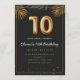 Adorable 10th birthday party invitation in a black and gold balloons design with golden tropical palm leaves. Customize with your party details and mail out to family and friends inviting them to celebrate the 10th birthday with style!