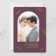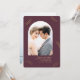 Ce beau faire-part de mariage de deux photos présente un élégant imprimé de simples voyants courbes couleur or sur un arrière - plan de prune foncé. L'avant comprend une photo en arc géométrique tendance, et l'arrière est une photo à fond de saignement du couple heureux.