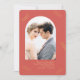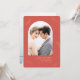 Ce faire-part de mariage moderne de deux photos présente un élégant imprimé de simples voyants courbes couleur or sur un arrière - plan rouge vif. L'avant comprend une photo en arc géométrique tendance, et l'arrière est une photo à fond de saignement du couple heureux.