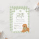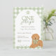 Celebrate your little one's first birthday with this "One Golden Year" birthday invitation. This adorable invitation features green gingham, a golden doodle wearing a green bow, and playful paw prints. Perfect for dog loving families, this sweet design adds a charming touch to any first birthday party.