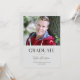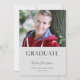 Ce carte photo moderne de graduation présente une typographie simple et une grande photo. Une photo horizontale du diplômé est en haut, avec le mot "Graduate" écrit dans la capitale branchée en bas. Sous la typographie, ajoutez le nom du diplômé en calligraphie script, avec l'école et l'année de diplôme au bas de la carte. La typographie est gris charbon contre un arrière - plan gris clair. Le verso de la carte de graduation comprend un modèle optionnel pour ajouter les détails de la fête de graduation.