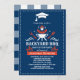 Linda invitación a la fiesta "Backyard BBQ" incluye un motivo de cierre de graduación, un elegante texto personalizado con fuentes rústicas y modernas, Se puede personalizar el fondo azul marino oscuro y el trenzado de manteles de gingham en la parte posterior de la tarjeta. Perfecto para una fiesta de graduación al aire libre.
