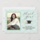 Photo graduation thank you cards. Pale mint green color with black text. Add your portrait photo to the front next to "Thank You" in script. A cap and diploma image separates the remaining text for the grad's name, school, and class. Include a personal message on the back, over a background of graduation caps. Or, delete all wording to hand write each thank you. Also buy this design as an instant download.