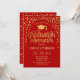 Invitation à la fête de fin d'études pour hommes ou femmes. Elégante carte invitation en rouge et or. Design simple et moderne avec des confettis de parties scintillant, un casquette et des scripts de typographie. Idéal pour une célébration élégante de remise des diplômes.