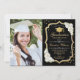 Invitation à la fête de remise des diplômes avec votre photo. Caractéristiques police de script, roses blanches, goût et confetti. Design élégant noir, blanc avec parties scintillant en or. Parfait pour une célébration élégante.