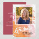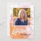 Cette invitation à la fête de remise de diplômes photo présente un arrière - plan à la mode rose et orange aquarelle. L'avant offre un cadre photo et du texte personnalisé pour la photo et le nom du diplômé. L'arrière offre du texte personnalisé pour les détails de la fête.