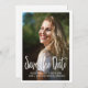 Photo de graduation Enregistrer la date / carte de faire-part formatée verticalement avec le texte du script de calligraphie. Le dos de la carte est blanc, mais la couleur est personnalisable avec l'outil de design de Zazzle. Contactez-nous pour obtenir de l'aide sur la personnalisation ou pour demander des produits correspondants.