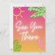 Vibrant and lively invitation design that combines tropical elements with bold neon colors.