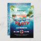 Ces invitations tropicales à la piscine et au barbecue sont assurées de faire rouler la fête d'été ! Modèles de texte à l'avant et modèle photo à l'arrière. Palmiers tropicaux et une île de plage en haut arrière - plan, eau réaliste avec radeau de sauvetage et canard jaune dans une excellente typographie.