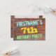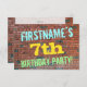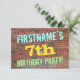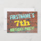 Ce design amusant d’invitation à la fête d’anniversaire comporte un message comme "FIRSTNAME’S 7th BANTHDAY PARTY!", où le nom peut être personnalisé, sur le devant. L'arrière - plan est représenté par un mur en brique composé de briques de couleur rougeâtre. Le texte de message personnalisable sur le devant présente des couleurs comme le bleu, le jaune et le vert, et il a un aspect inspiré de celui des graffitis peints. Le verso comporte un message personnalisable qui pourrait inclure des détails pertinents sur la fête d'anniversaire. Des invitations à des fêtes d'anniversaire comme celle-ci pourraient être une façon amusante pour la famille et les amis invitations d'une fête d'anniversaire organisée pour quelqu'un qui célèbre son septième anniversaire. [~Z0000287]