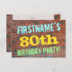 Ce design amusant d’invitation à la fête d’anniversaire comporte un message comme "FIRSTNAME’S 80th BANTHDAY PARTY!", où le nom peut être personnalisé, sur le devant. L'arrière - plan est représenté par un mur en brique composé de briques de couleur rougeâtre. Le texte de message personnalisable sur le devant présente des couleurs comme le bleu, le jaune et le vert, et il a un aspect inspiré de celui des graffitis peints. Le verso comporte un message personnalisable qui pourrait inclure des détails pertinents sur la fête d'anniversaire. Des invitations à des fêtes d'anniversaire comme celle-ci pourraient être une façon amusante pour la famille et les amis invitations d'une fête d'anniversaire organisée pour quelqu'un qui célèbre son quatre-vingtième anniversaire. [~Z0000287]