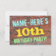 Ce design amusant d’invitation à la fête d’anniversaire comporte un message comme "NOM-HERE’S 10th BIRTHDAY PARTY!", où le nom peut être personnalisé, sur le devant. Le arrière - plan est représenté par un mur en brique composé de briques de couleur rougeâtre et marron. Le texte du message personnalisable sur le devant présente des couleurs comme le bleu, le jaune et le vert, et il a un aspect inspiré de celui des graffitis peints. Le verso comporte un message personnalisable qui peut inclure des détails pertinents sur la fête d'anniversaire. Des invitations à des fêtes d'anniversaire comme celle-ci pourraient être une façon amusante pour la famille et les amis invitations d'une fête d'anniversaire organisée pour quelqu'un qui fête son dixième anniversaire. [~Z0000287]