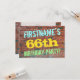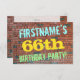 Ce design amusant d’invitation à la fête d’anniversaire comporte un message comme "FIRSTNAME’S 66th BIRTHDAY PARTY!", où le nom peut être personnalisé, sur le devant. Le arrière - plan est représenté par un mur en brique composé de briques de couleur rougeâtre et marron. Le texte du message personnalisable sur le devant présente des couleurs comme le bleu, le jaune et le vert, et il a un aspect inspiré de celui des graffitis peints. Le verso comporte un message personnalisable qui peut inclure des détails pertinents sur la fête d'anniversaire. Des invitations à des fêtes d'anniversaire comme celle-ci pourraient être une façon amusante pour la famille et les amis invitations d'une fête d'anniversaire organisée pour quelqu'un qui célèbre son soixante-sixième anniversaire. [~Z0000287]