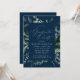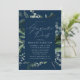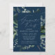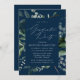 Invitations élégantes à la fête de remise des diplômes avec le nom du diplômé et les détails de la fête niché à l'intérieur d'un cadre rectangulaire entouré d'eucalyptus, fougères et autres riches verdure sur un arrière - plan de la marine. Les invitations à la remise des diplômes botaniques modernes sont parfaites pour les diplômés du secondaire et du collège.