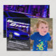 Mettez les gaz et courez jusqu'à la ligne d'arrivée pour célébrer l'anniversaire de votre fils. Cette invitation unique a été dessinée numériquement pour illustrer une voiture de sport très rapide lors d'un concours de course de rue nocturne où personne ne peut rattraper