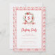 This Christmas party invitation has a preppy grandmillennial design featuring a floral crest surrounded with berries with a monogram letter in the center. The front and back have a coordinating damask pattern.