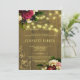 Une belle invitation rustique traditionnelle à la douche nuptiale / brunch nuptiale avec automne bouquets de fleurs de bordeaux foncé, rouge vif et crème pêche roses, et des pivoines, cordes de lumières scintillantes et un script de calligraphie en faux or chic sur un arrière - plan de bois de grange beige brun. +++++++++++++++ L'invitation est également adapté pour la nuit d'été rustique pays / jardin extérieur / mariages à thème de la ferme.