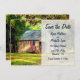 Cette annonce de mariage Enregistrer la Date présente une grange rustique avec un drapeau américain patriotique dans un cadre champêtre boisé charmant.
