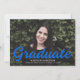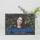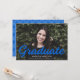 Invitation simple et élégante à la remise des diplômes avec la photo horizontale du diplômé avec "Graduate" dans une écriture bleue en gras. Personnalisez l'invitation de la fête de remise de diplômes en y ajoutant le nom du diplômé, le nom de l'école et l'année de remise de diplômes. L'invitation inverse pour afficher les détails de votre fête de graduation avec un arrière - plan motif d'arc géométrique bleu et blanc.