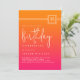 Audacieuse, belle et si élégante, cette simple invitation à la fête du 25ème anniversaire minimaliste a une ambiance rétro. Des couleurs claires et foncées dans les tons orange et rose chaud se mélangent dans une explosion de couleurs, parfait pour une fête. Les couleurs ressemblent à un lever de soleil et à l'aube d'une nouvelle ère ! La disposition minimaliste moderne s'associe à la typographie blanche, avec un audacieux sans-serif pour les détails de l'événement et un script manuscrit gracieux pour le mot "Anniversaire". Un badge carré élégant souligne l'âge du jalon, ajoutant une touche sophistiquée pour toute célébration d'anniversaire adulte. Ces invitations peuvent être commandées en format numérique à la fois imprimé et instantané.