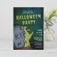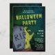 Cette invitation de la fête d'Halloween moderne présente une main zombie verte qui sort d'une tombe dans une scène de cimetière effrayante. La typographie est amusante mais éffrayante. C'est l'invitation parfait pour une fête d'Halloween amusante !