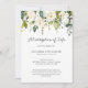 Invitation de commémoration funéraire avec une nature, florale, aquarelle invitation célébration de la vie modèle qui est facile à personnaliser. Design botanique élégant, blanc et verdoyant avec texte gris.