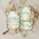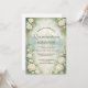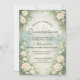 This refined quinceañera design features a soft sage-green watercolor background framed by lush ivory roses, delicate greenery, and elegant gold ornamental accents. The botanical border creates a romantic garden atmosphere while preserving a light, open center for excellent text clarity in print.