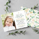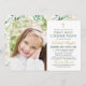 Cette élégante invitation de la Première Sainte Communion conçue pour une fille comprend une photo de 3,5 x 5 pouces de votre fille avec du texte vert, or et noir souple qui peut être entièrement personnalisée pour votre événement, accentué par une croix d'or. Un beau motif floral de fleurs roses neutres blanches, roses rousses et crème, vert et or, met en valeur le dos de la carte.