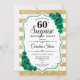 Invitation de fête du 60e anniversaire surprise. Design vert émeraude féminin avec parties scintillant d'or faux. Avec des rayures blanches et dorées, des roses, des caractères de script et des confettis. Parfait pour une célébration anniversaire féminine élégante. Peut être personnalisé pour montrer n'importe quel âge. Invitations Zazzle imprimées ou téléchargement instantané modèle imprimable numérique.