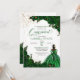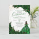 Quinceanera invitation en rose vert émeraude avec des accents or et une fille avec une élégante robe de bal princesse. Consultez la boutique pour cette invitation avec des filles dans différentes couleurs de cheveux et de teintes de peau.