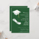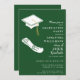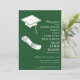 Cette simple invitation de remise de diplômes comprend des illustrations de casquette et de diplôme d'un diplômé et un modèle pour personnaliser l'invitation avec le nom de la diplômée, l'année, le nom de l'école, la date, le lieu et les données RSVP. Ce design est dans les tons vert et blanc.