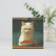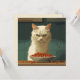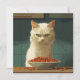 L'image représente un chat blanc à l'expression sérieuse, presque mécontente, regardant attentivement un bol complet de nourriture pour chat devant lui. L'arrière - plan est carrelée de vert foncé, ce qui ajoute à l'atmosphère concentrée et légèrement dramatique. La fourrure du chat est détaillée, et ses yeux verts sont rétrécis, ce qui lui donne une présence forte et commandante. Le style général rappelle l'art vectoriel, avec des lignes épurées et des couleurs audacieuses.