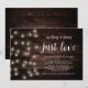 Rien de fantaisie, juste de l'amour, annonce de mariage en fuite / carte d'invitation à une fête, dans un thème de lumières guirlandes rustiques modernes, papier brun en bois. C'est parfait pour votre réception de mariage et votre fête de célébration après le mariage. Ajoutez vos détails dans une police / lettrage assorti.