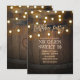 Cartes d'invitation pour fête d'anniversaire avec guirlande lumineuse en tonneau en bois rustique.