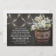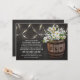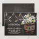 Faire-part de mariage champêtre élégant avec un fond rustique en tableau noir, guirlande de lumières scintillantes, fleurs blanches, tonneau de vinicole en bois avec vos initiales et un morceau de ficelle nouée.