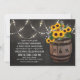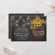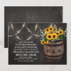 Faire-part de mariage champêtre élégant avec un fond rustique de tableau noir, des guirlandes de lumières scintillantes, des tournesols jaunes dorés d'été, un tonneau de vin en bois avec vos initiales et un morceau de ficelle nouée.