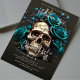 Costumes d'Halloween Soirée Crâne bleu Turquoise Invitation moderne. Venez fêter votre fête avec notre Invitation de fête d'Halloween adulte! cette invitation personnalisable est parfaite pour une célébration d'Halloween unique et inoubliable. Avec un texte facile à éditer pour les détails de la fête, laissez les festivités commencer dans le style avec notre invitation sombre qui promet une expérience de fête éffrayante mais à la mode!