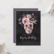 Une éffrayante invitation à la fête d'anniversaire d'Halloween avec une illustration crâne florale surmontée de fleurs d'aquarelle rose et violet sur un arrière - plan noir fumé. Personnalisez cette invitation unique et élégante à la fête d'anniversaire d'Halloween avec vos détails de l'événement en lettres blanches et fumées.