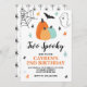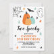Deux Éffrayants ! Invitation à la fête d'anniversaire d'Halloween. Soyons éffrayants ! invitation de bash d'anniversaire avec des citrouilles turquoise, des étoiles et des araignées.