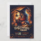 Invitation avec une belle sorcière dans la forêt avec une lanterne et jack-o-lanternes.