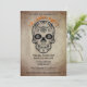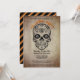 Invitations éffrayantes à la fête d'Halloween - l'Arrière - plan ressemble à du papier taché vintage. Lit 'Vous avez été convoqué à une fête d'Halloween' en noir et orange couleurs d'Halloween. Un crâne à sucre pour les célébrations du Jour des morts se trouve en dessous. Détails de la fête d'Halloween, y compris les informations RSVP, en noir. Style effrayant, Goth en bas de la lettre dit "Portez une tenue éffrayante correcte pour éviter d'être hexée". Le dos a diagonale noir et orange rayures arrière - plan. Utilisez le bouton Customiser pour modifier l'apparence - styles, tailles, couleurs ou placement de police. Des invitations d'Halloween amusantes et effrayantes, prêtes à être personnalisées avec vos propres détails de soirée d'Halloween.