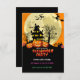 Scary adult halloween party invitations featuring a black background, creepy fall pumpkins, spiderwebs, bats, and a spooky personalized halloween template that is easy to customize.