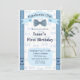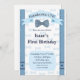 Baby Boy First Birthday Invitation blue bow tie and suspenders, for a Handsome One theme.