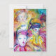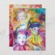 Trois personnages fantaisistes et cool du Théâtre Vénitien : Arlequin, Pierrot et Colombine : Masques vénitiens élégants et vibrants, design artistique avec fantaisie florale colorée, feuilles de fleurs volantes dans des étincelles dorées, jaune vif, orange, rouge, rose, fuchsia, violet, vert, marron et fioritures violettes. Peinture originale à l'aquarelle avec feuille d'or et d'argent inspirée de la Comédie de l'Art (Commedia dell'arte) et du Carnaval de Venise. Conception graphique numérique par Bulgan Lumini - Baldesign3d (c)