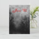 Un modèle d'invitation à la coutume avec des lettres grincheuses sur un ciel d'Halloween éffrayant avec des arbres brumeux le long d'une route obscurcie, des corbeaux gothiques et une pleine lune nuageuse en noir et blanc.