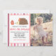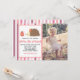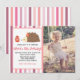 Une invitation à la fête d'anniversaire avec un arrière - plan à rayures roses et personnalisable, avec un hérisson portant un casquette de fête avec un cupcake aux fraises.