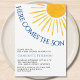 It features the text "Here Comes The Son" in blue retro typography with a yellow watercolor sun.