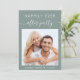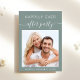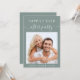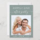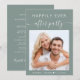 Invitation à la réception post-mariage à la sauge verte avec votre photo, "Happily Ever After Party" dans un mélange de lettres blanches simples et un script blanc élégant et vos prénoms et votre date de mariage ou de réception réunis par un coeur. Personnalisez vos détails de réception et ajoutez vos noms dans un script de type signature au dos.