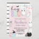 Une fête d'halloween pas éffrayante ! Aquarelle pastel rose, violet, vert et pêche Hey Boo Ghost Halloween invitation anniversaire avec arrière - plan rayé noir et blanc.