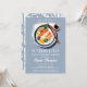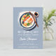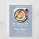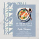 Une invitation à la fête d'anniversaire moderne, élégante, minimaliste et simple, avec un thème hibachi, soirée japonaise. Il présente une aquarelle moderne illustrant une plaque d'hibachi sur un arrière - plan bleu poussiéreux et une typographie simple, moderne et blanche. Sur le dos, une forêt de bambous sauvages. Un design épuré, minimaliste et simple pour une soirée élégante.